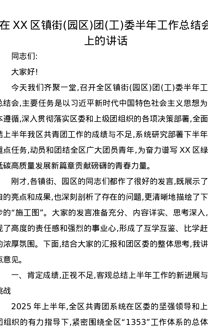 在XX区镇街(园区)团(工)委半年工作总结会上的讲话