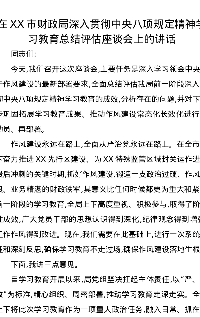 在XX市财政局深入贯彻中央八项规定精神学习教育总结评估座谈会上的讲话