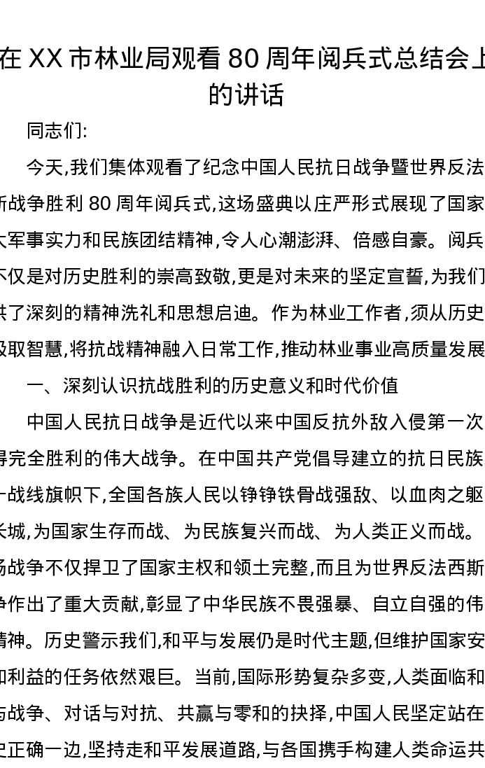 在XX市林业局观看80周年阅兵式总结会上的讲话