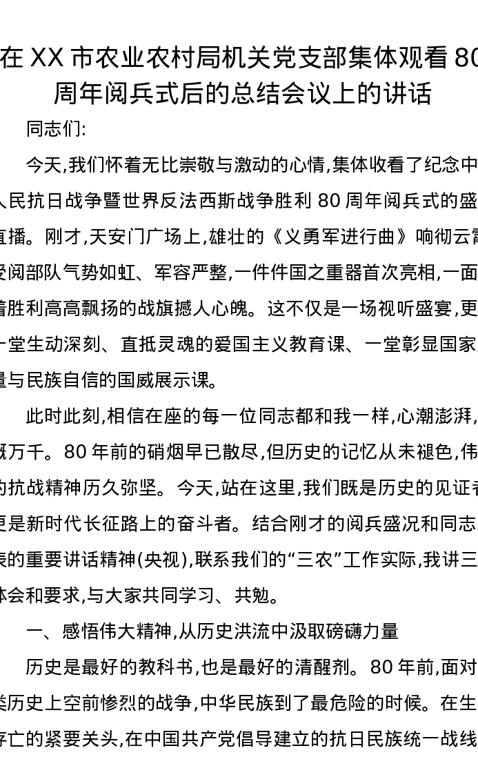 在XX市农业农村局机关党支部集体观看80周年阅兵式后的总结会议上的讲话