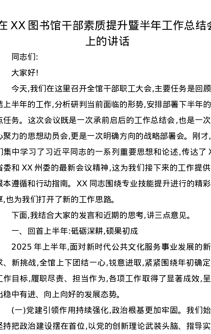 在XX图书馆干部素质提升暨半年工作总结会上的讲话