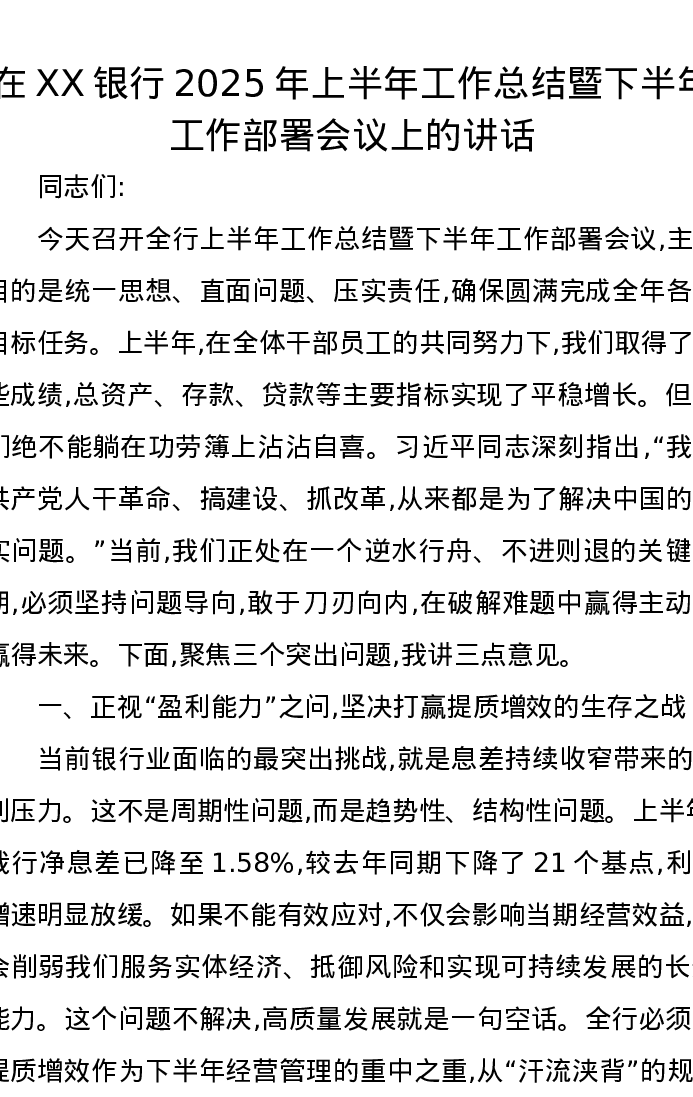 在XX银行2025年上半年工作总结暨下半年工作部署会议上的讲话2