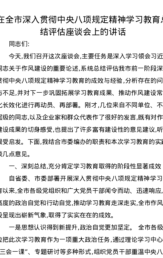 在全市深入贯彻中央八项规定精神学习教育总结评估座谈会上的讲话4