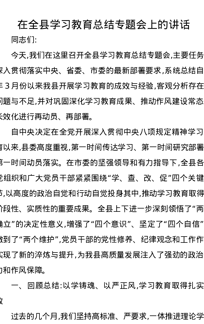 在全县贯彻中央八项规定精神学习教育总结专题会上的讲话