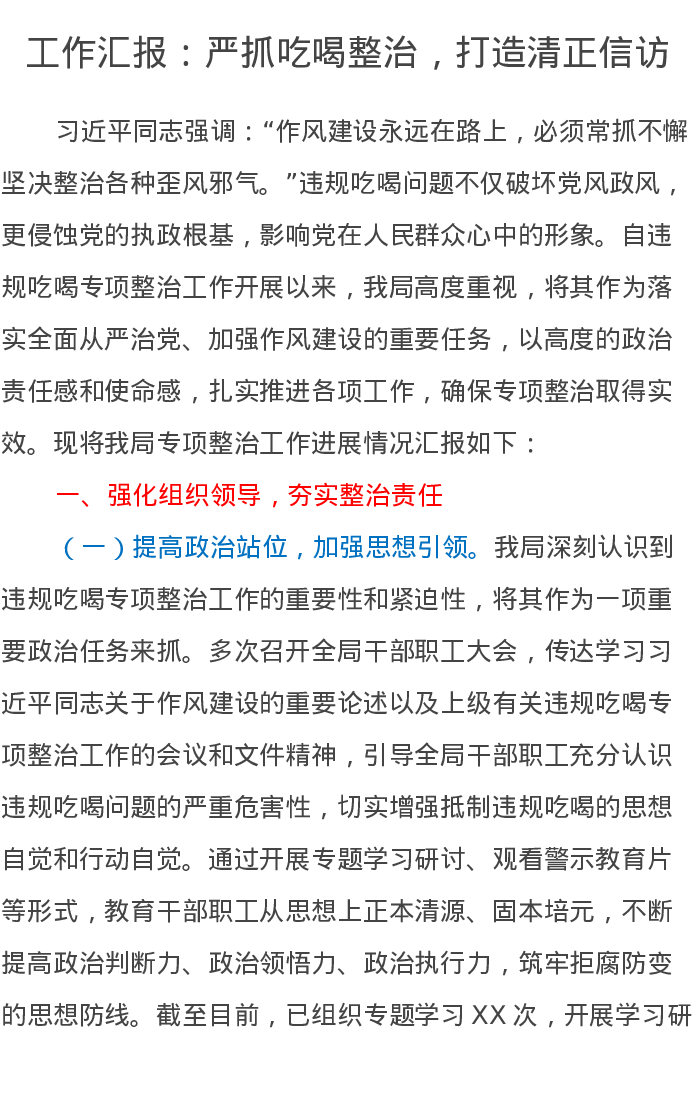 工作汇报:严抓吃喝整治,打造清正信访