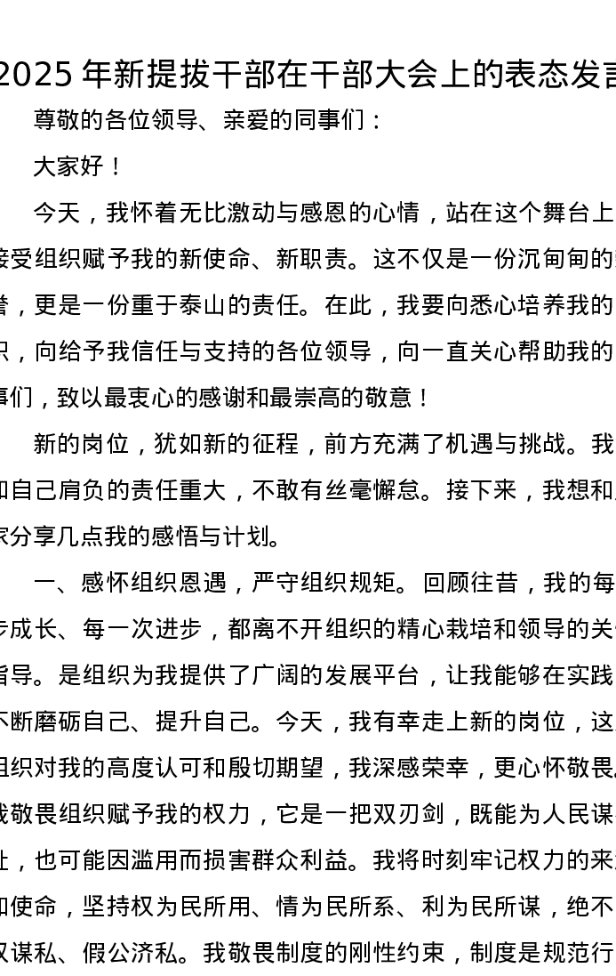 2025年新提拔干部在干部大会上的表态发言