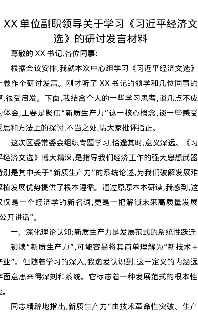 XX单位副职领导关于学习《习近平经济文选》的研讨发言材料