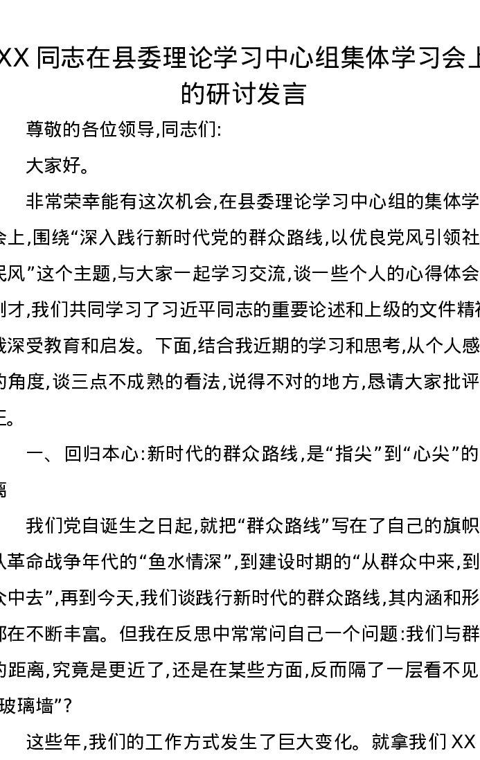 XX同志在县委理论学习中心组集体学习会上的研讨发言