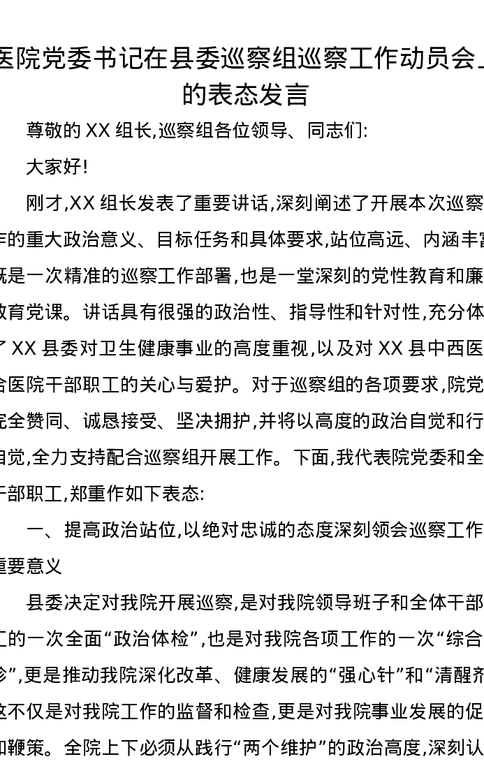 XX县中西医结合医院党委书记在县委第X巡察组巡察工作动员会上的表态发言