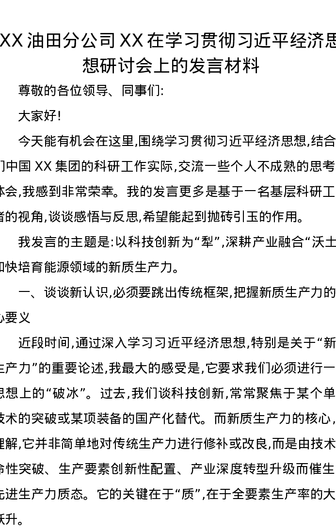 XX油田分公司XX在学习贯彻习近平经济思想研讨会上的发言材料