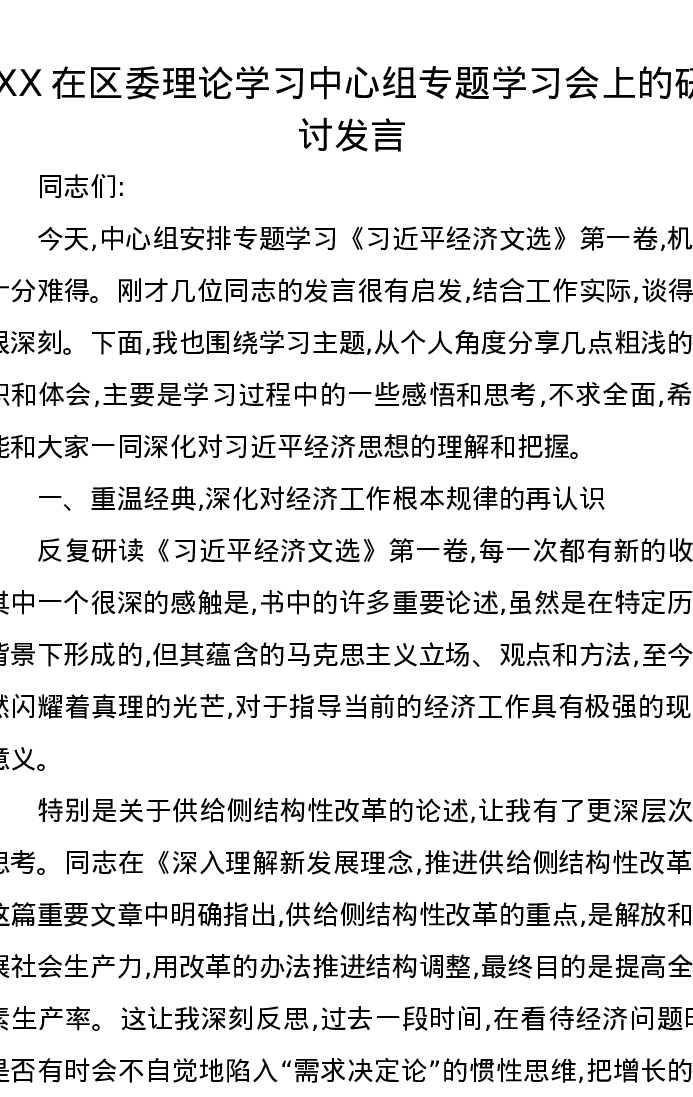 XX在区委理论学习中心组专题学习会上的研讨发言