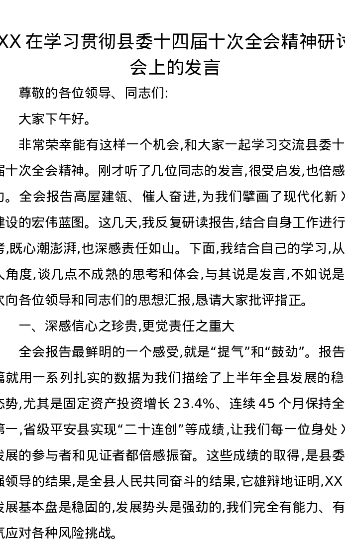 XX在学习贯彻县委十四届十次全会精神研讨会上的发言