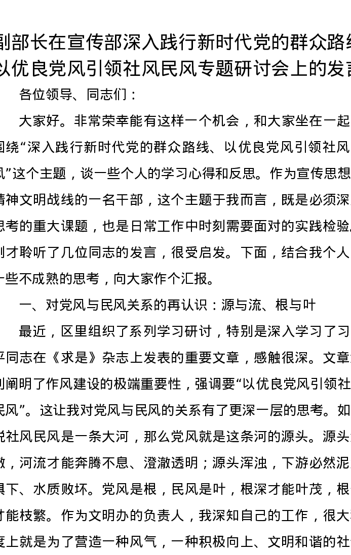 副部长在宣传部深入践行新时代党的群众路线、以优良党风引领社风民风专题研讨会上的发言