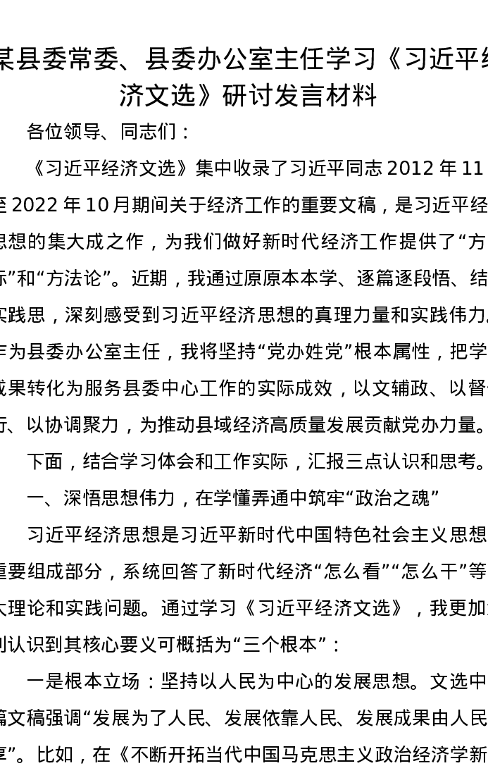 某县委常委、县委办公室主任学习《习近平经济文选》研讨发言材料
