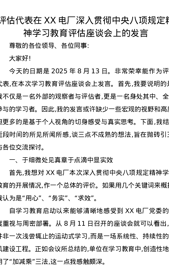 评估代表在XX电厂深入贯彻中央八项规定精神学习教育评估座谈会上的发言