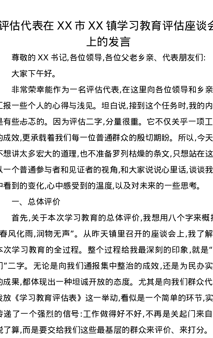 评估代表在XX市XX镇贯彻中央八项规定精神学习教育评估座谈会上的发言