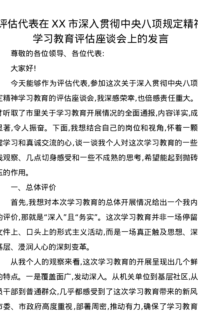 评估代表在XX市深入贯彻中央八项规定精神学习教育评估座谈会上的发言