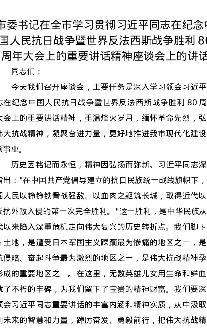 市委书记在全市学习贯彻习近平总书记在纪念中国人民抗日战争暨世界反法西斯战争胜利80周年大会上的重要讲话精神座谈会上的讲话