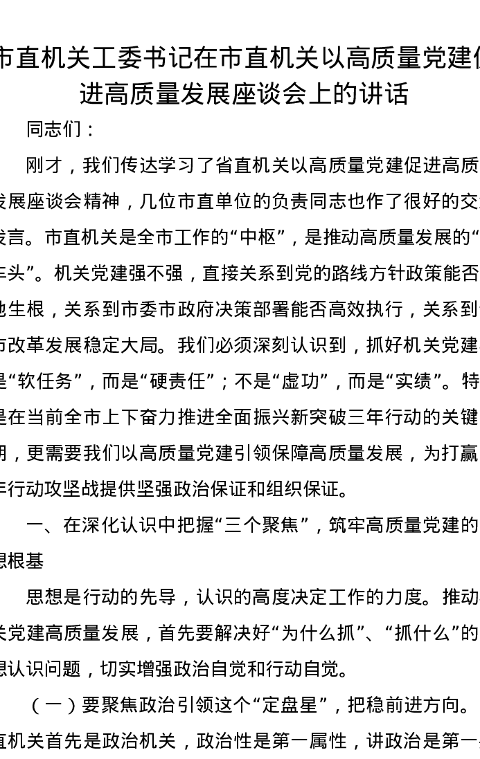 市直机关工委书记在市直机关以高质量党建促进高质量发展座谈会上的讲话