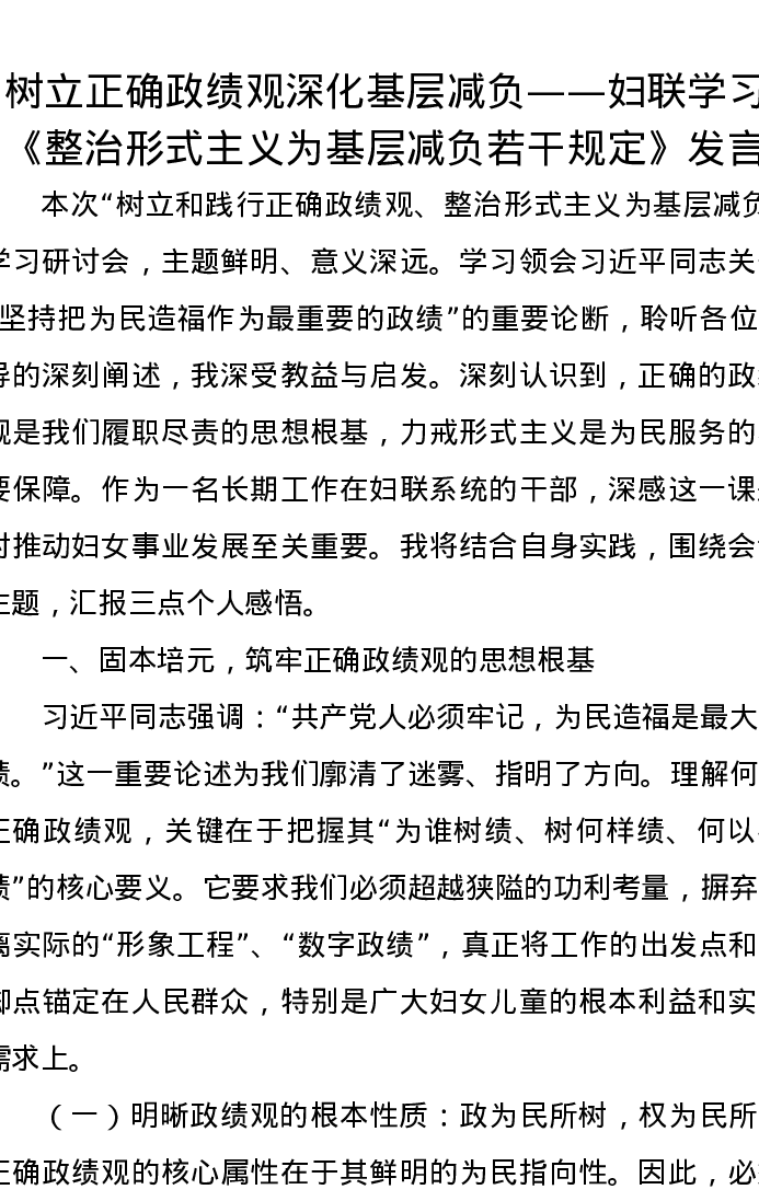 树立正确政绩观深化基层减负——妇联学习《整治形式主义为基层减负若干规定》发言