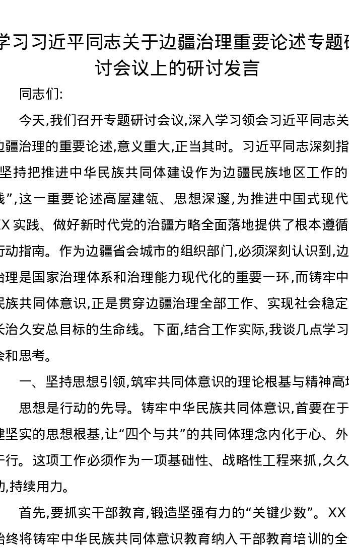 学习习近平总书记关于边疆治理重要论述专题研讨会议上的研讨发言