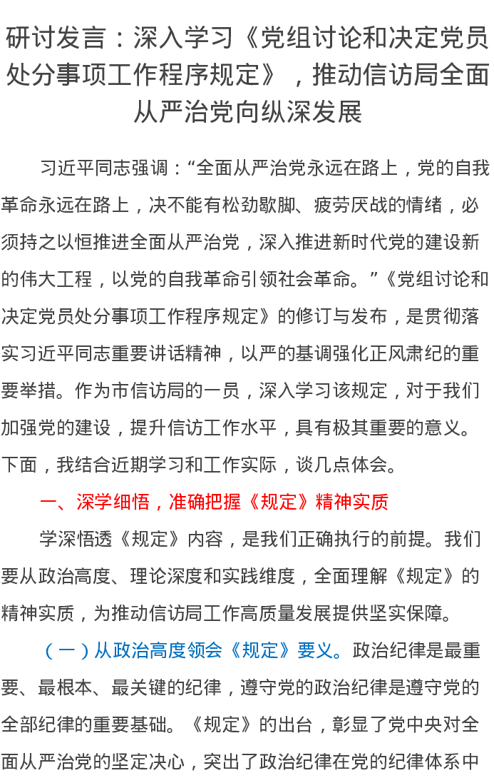 研讨发言:深入学习《党组讨论和决定党员处分事项工作程序规定》,推动信访局全面从严治党向纵深发展