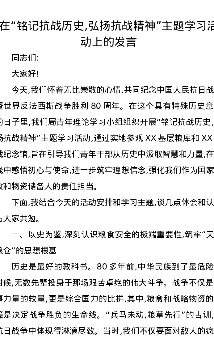 在“铭记抗战历史,弘扬抗战精神”主题学习活动上的发言