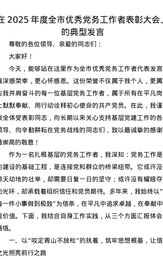 在2025年度全市优秀党务工作者表彰大会上的典型发言