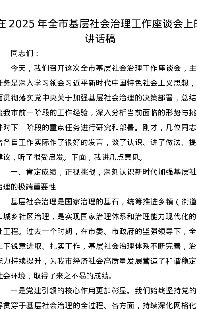 在2025年全市基层社会治理工作座谈会上的讲话稿