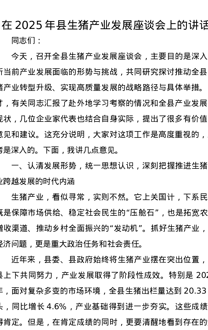 在2025年县生猪产业发展座谈会上的讲话