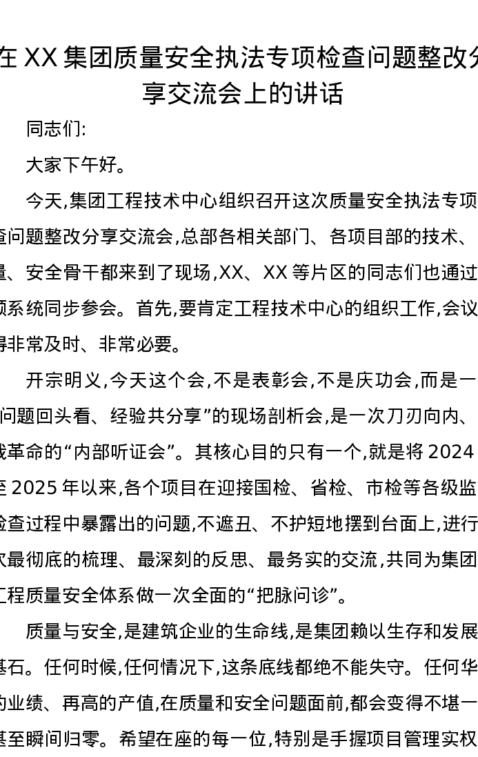 在XX集团质量安全执法专项检查问题整改分享交流会上的讲话