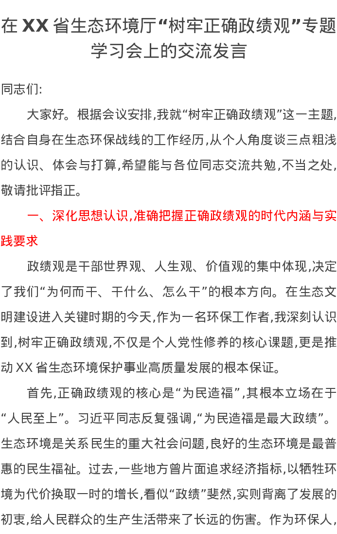 在XX省生态环境厅“树牢正确政绩观”专题学习会上的交流发言