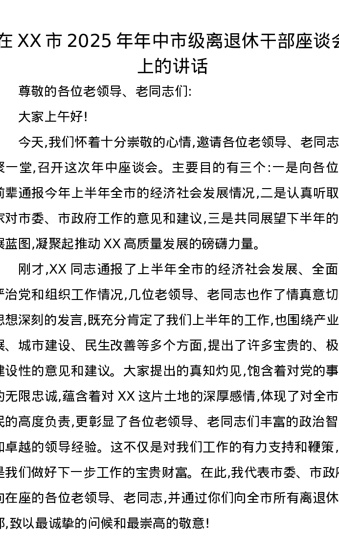 在XX市2025年年中市级离退休干部座谈会上的讲话