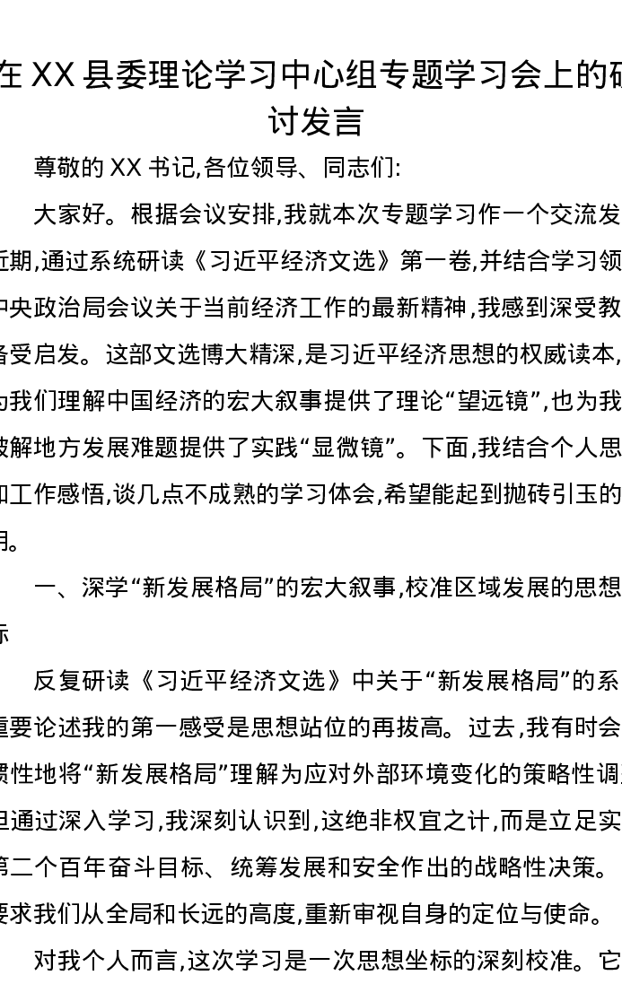 在XX县委理论学习中心组专题学习会上的研讨发言