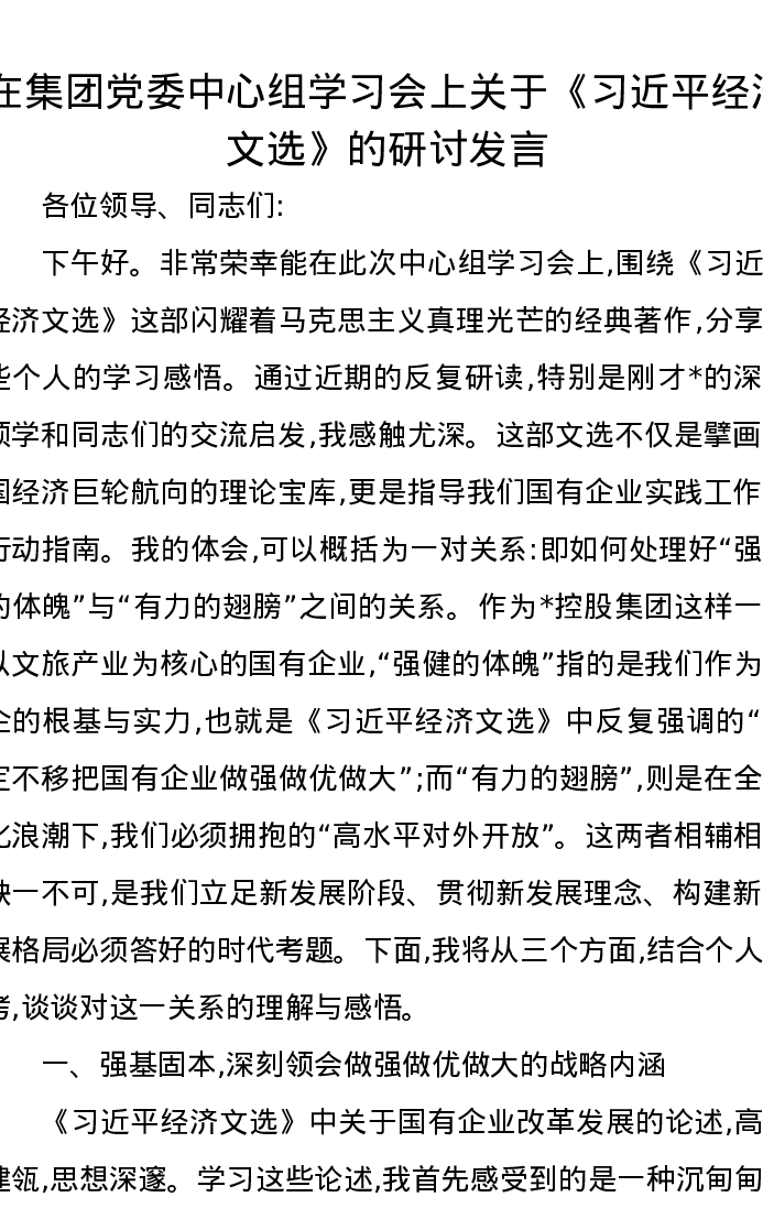 在集团党委中心组学习会上关于《习近平经济文选》的研讨发言
