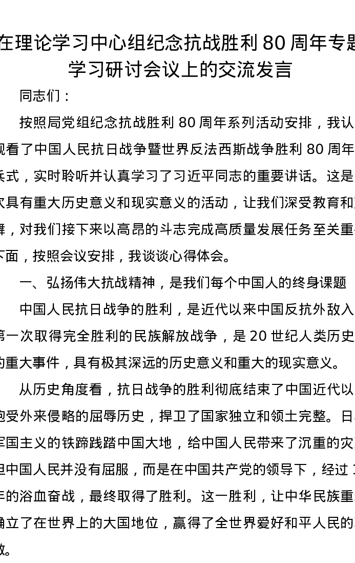 在理论学习中心组纪念抗战胜利80周年专题学习研讨会议上的交流发言