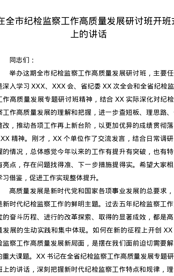 在全市纪检监察工作高质量发展研讨班开班式上的讲话