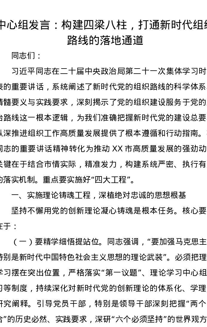 中心组发言:构建四梁八柱,打通新时代组织路线的落地通道