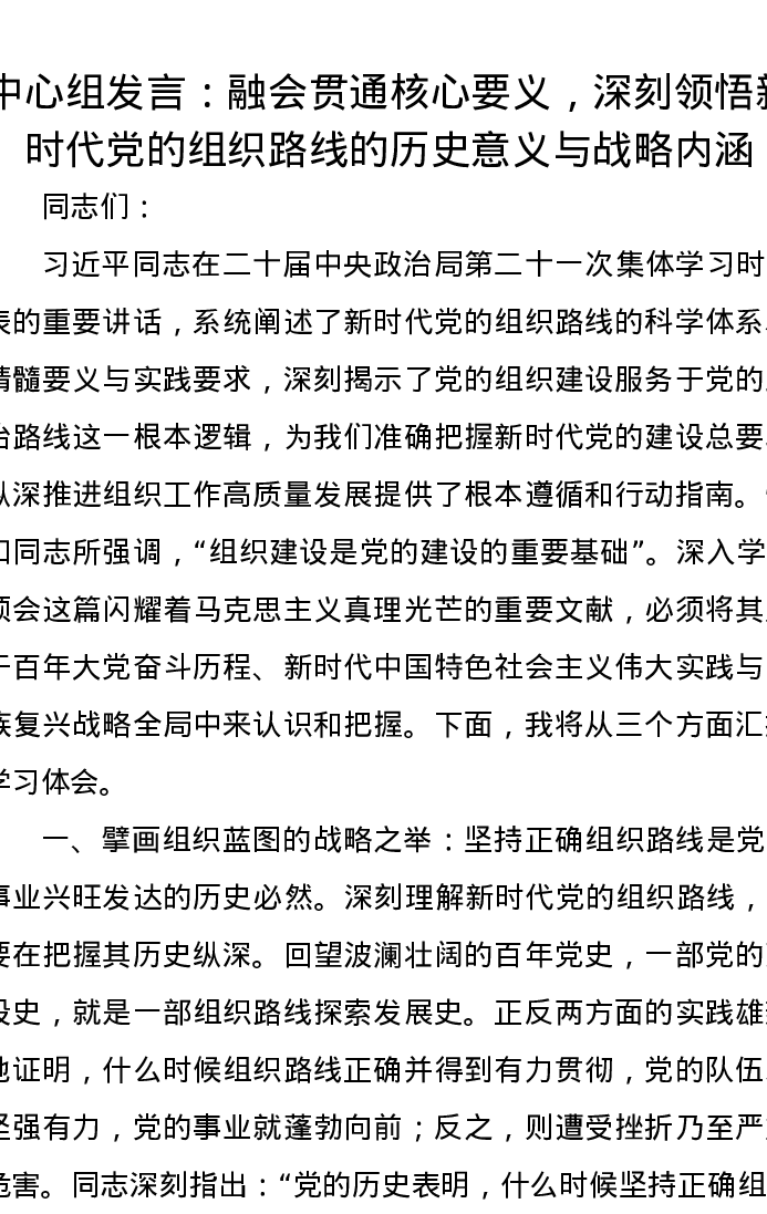 中心组发言:融会贯通核心要义,深刻领悟新时代党的组织路线的历史意义与战略内涵