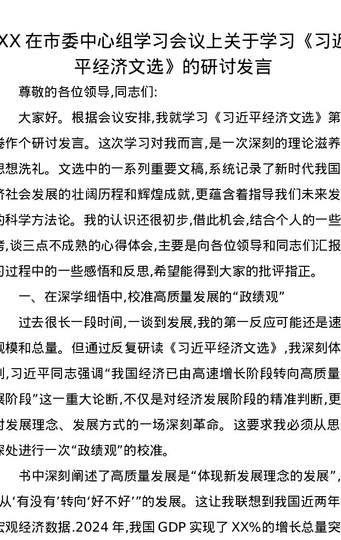 XX在市委中心组学习会议上关于学习《习近平经济文选》的研讨发言