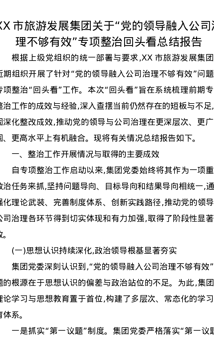 XX市旅游发展集团关于“党的领导融入公司治理不够有效”专项整治回头看总结报告