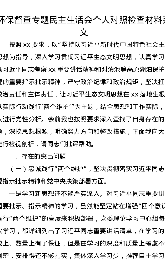 环保督查(生态文明)专题民主生活会个人对照检查材料