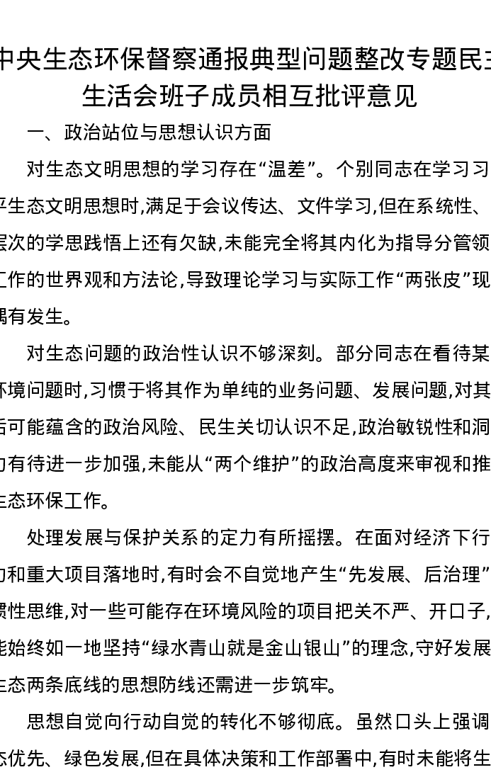 中央生态环保督察通报典型问题整改专题民主生活会班子成员相互批评意见