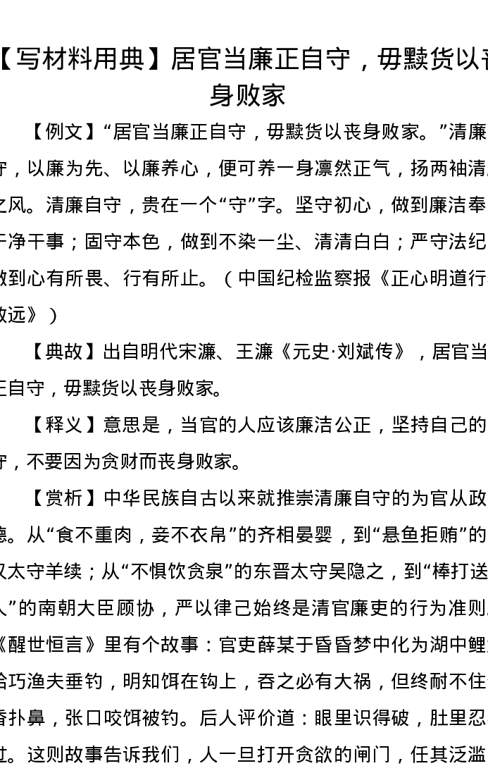 【写材料用典】居官当廉正自守,毋黩货以丧身败家