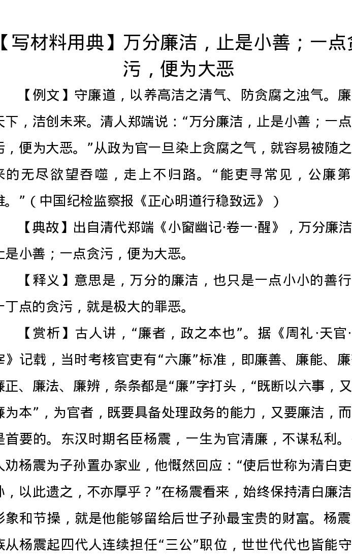 【写材料用典】万分廉洁,止是小善;一点贪污,便为大恶