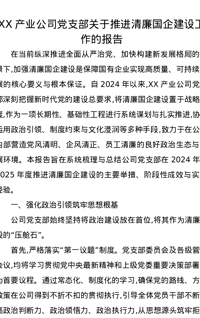 XX产业公司党支部关于推进清廉国企建设工作的报告