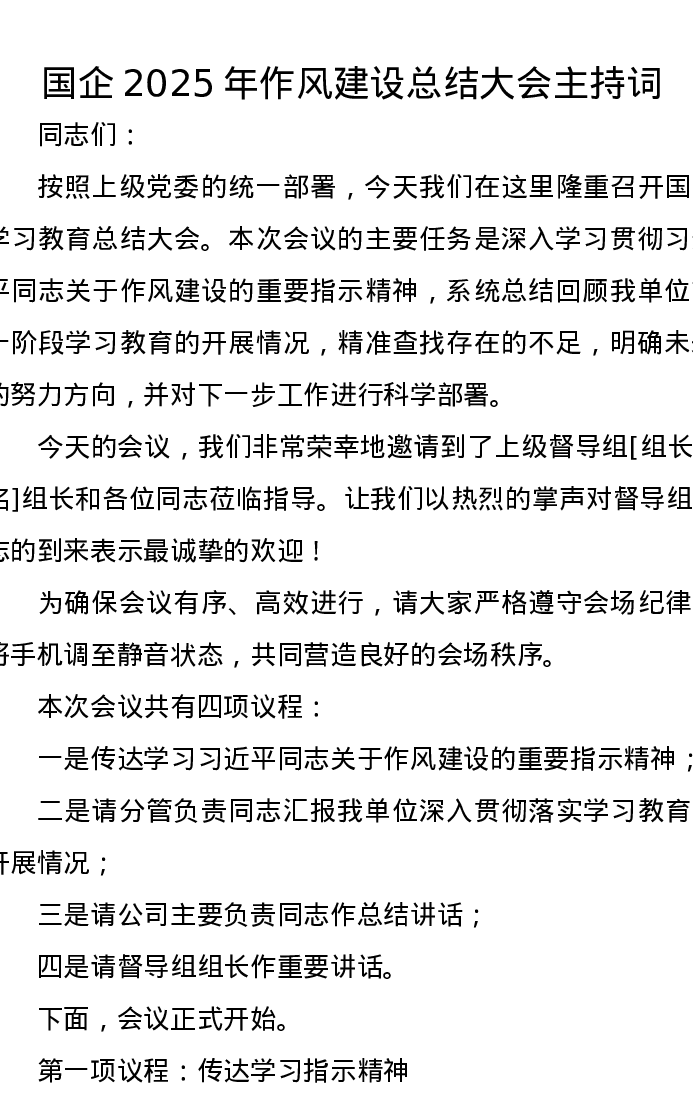 国企2025年作风建设总结大会主持词