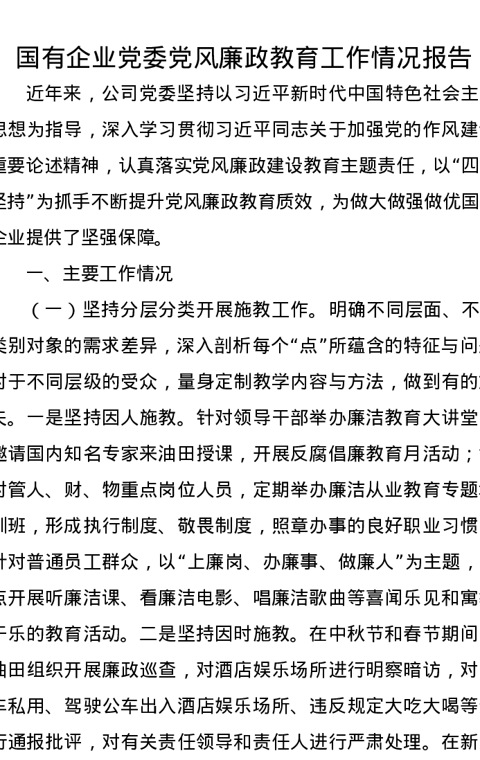 国有企业党委党风廉政教育工作情况报告