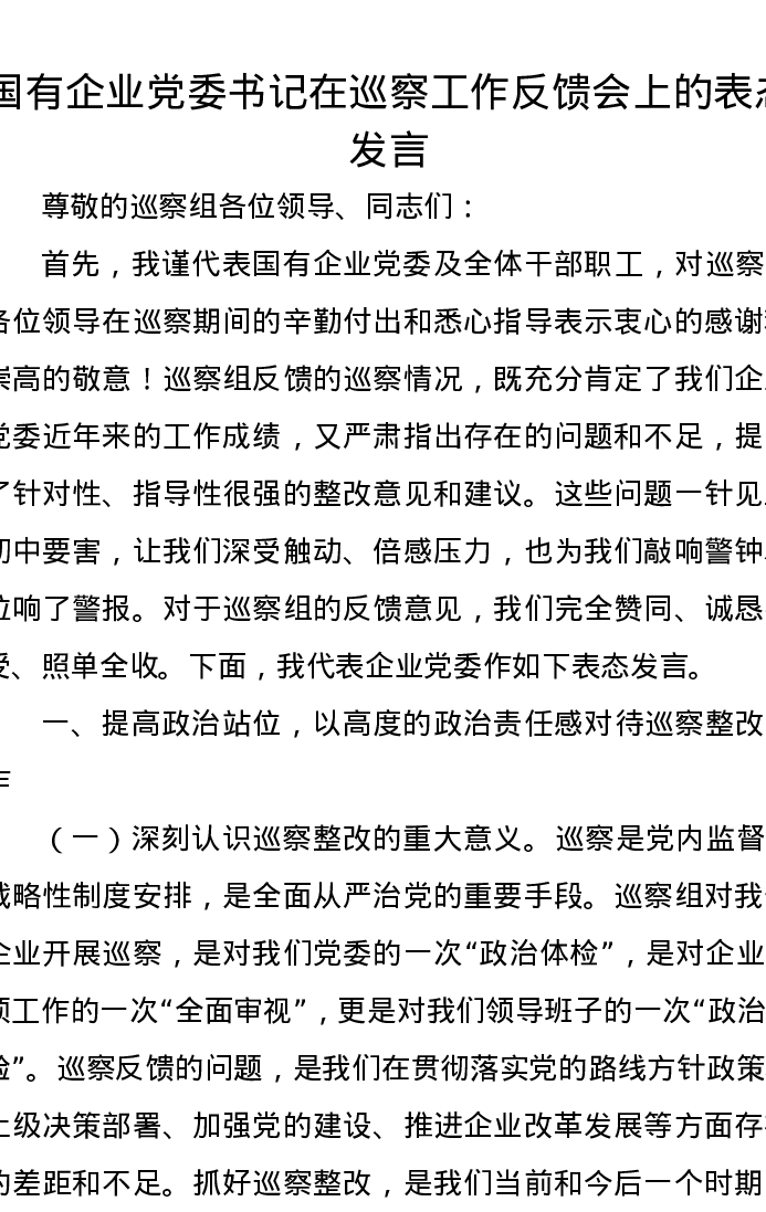 国有企业党委书记在巡察工作反馈会上的表态发言