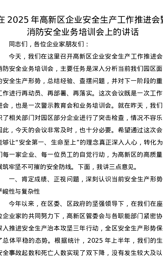 在2025年高新区企业安全生产工作推进会暨消防安全业务培训会上的讲话